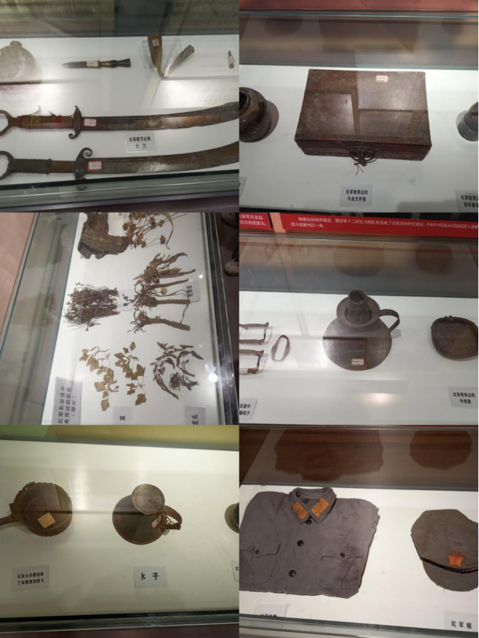 “红军不怕远征难,万水千山只等闲。”如今天朗气清,岁月一片静好,谁也想不到一百年前,中共红军万里长征的伟大奇迹在一百年前开始谱写。随后我们跟随讲解员的步伐来到另一个展厅,这里保留了许多长征时红军用过的物品,如衣物、笔筒、斗盘、筹款箱、木升子、清油灯、油坛、牛皮文件箱、脚码子、针线篮、风匣,还刻画了部分红军打仗时的情景。