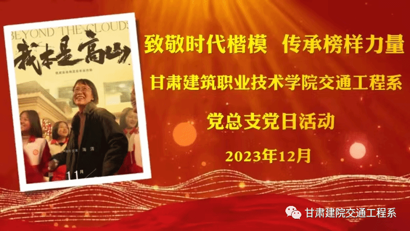 百年大计,教育为本;教育大计,教师为本。为贯彻落实习近平总书记关于教育的重要论述,持续推进我系教师队伍师德师风建设,推动我系教师坚守教育初心,践行立德树人根本任务,大力宣传“时代楷模”厚重的感人事迹,发挥燃灯精神,补足精神之钙,引导教师党员、学生预备党员通过观影有所思、有所悟、有所得,励志成为一个有大爱、有理想、有信仰的共产党员。2023年12月9日,甘肃建筑职业技术学院交通工程系党总支组织教师党员、学生预备党员共计36人观看教育题材影片《我本是高山》。