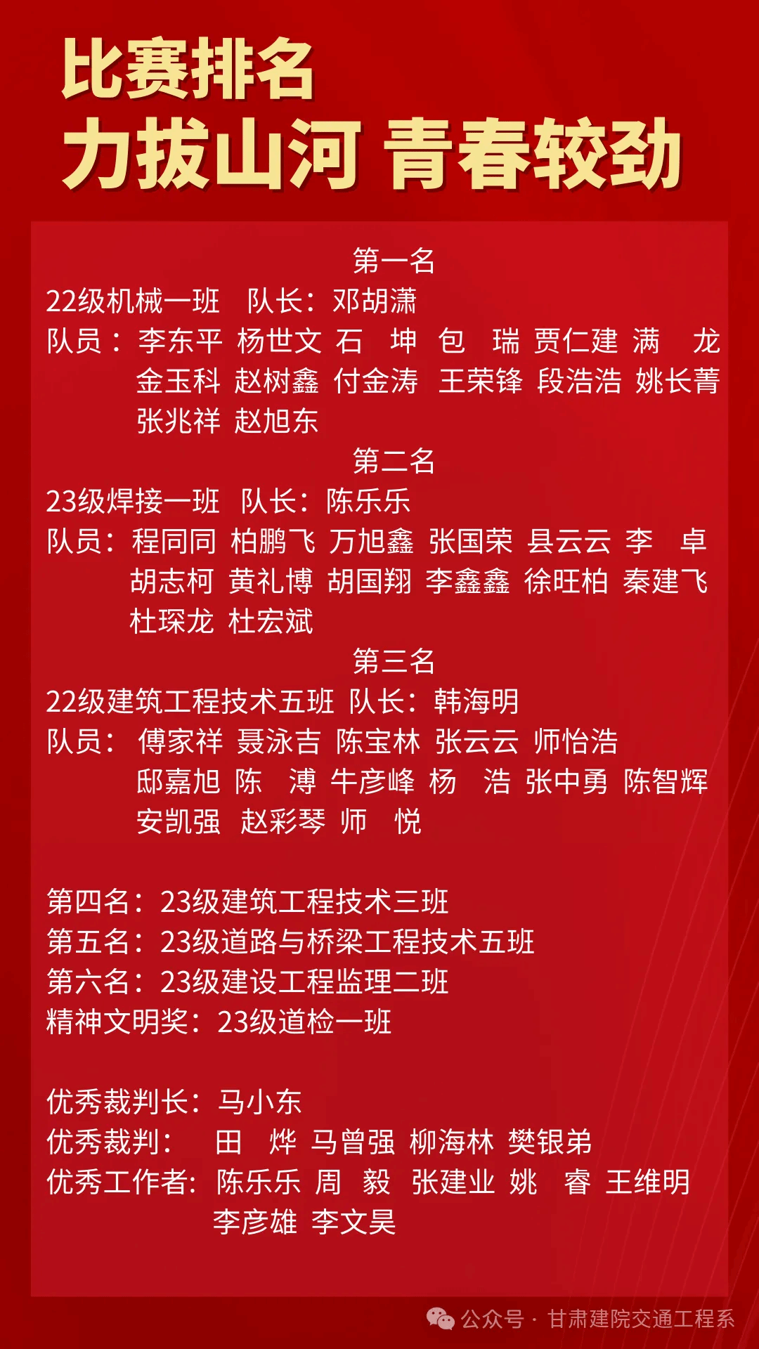在本次联合比赛之前,交通工程系内部进行了选拔赛,通过选拔赛从八支队伍中选出了六支参赛队伍,和建筑工程系的六支参赛队伍进行比赛,选拔赛期间,系部各班级选手们全力以赴,为了班级荣誉,齐心协力、重心后移,双脚蹬地,充分诠释了“技”与“力”较量之美,拔出了“力拔山兮气盖世”的气势。