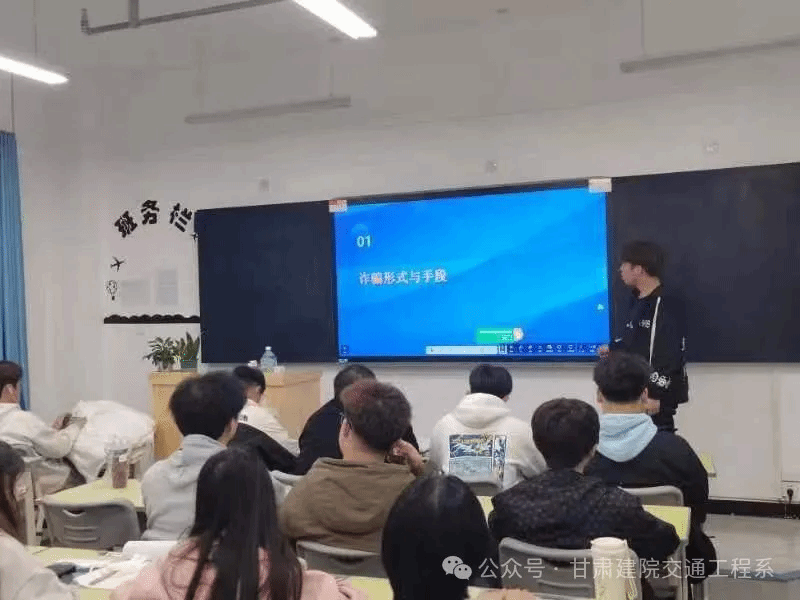 近年来,随着通讯技术发展的多样化,电信诈骗手段和形式也开始呈现出多样化趋势,大学生被电信诈骗的案例屡见不鲜。因此,为了进一步提高同学们防范各类电信诈骗的意识,维护自身财产安全,提升同学们的自我保护能力,甘肃建筑职业技术学院交通工程系学生委员会于2024年3月22日晚在901开展了“预防电信诈骗”安全教育活动。