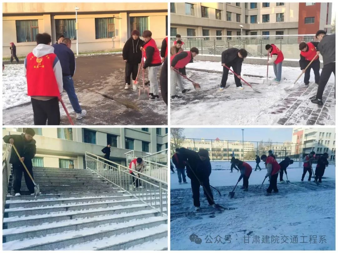 大雪飘然而至,一夜间,校园银装素裹,白雪如霜,雾凇沆砀,更增添了几分冬日气息。大雪带来了不可多得的美景但也带来了诸多不便。为积极应对路面积雪积冰给师生出行带来的影响,保障师生出入安全和教学工作正常运行。2024年11月25日下午四点,甘肃建筑职业技术学院交通工程学院团总支与学生委员会组织扫雪队伍,积极参加扫雪工作。