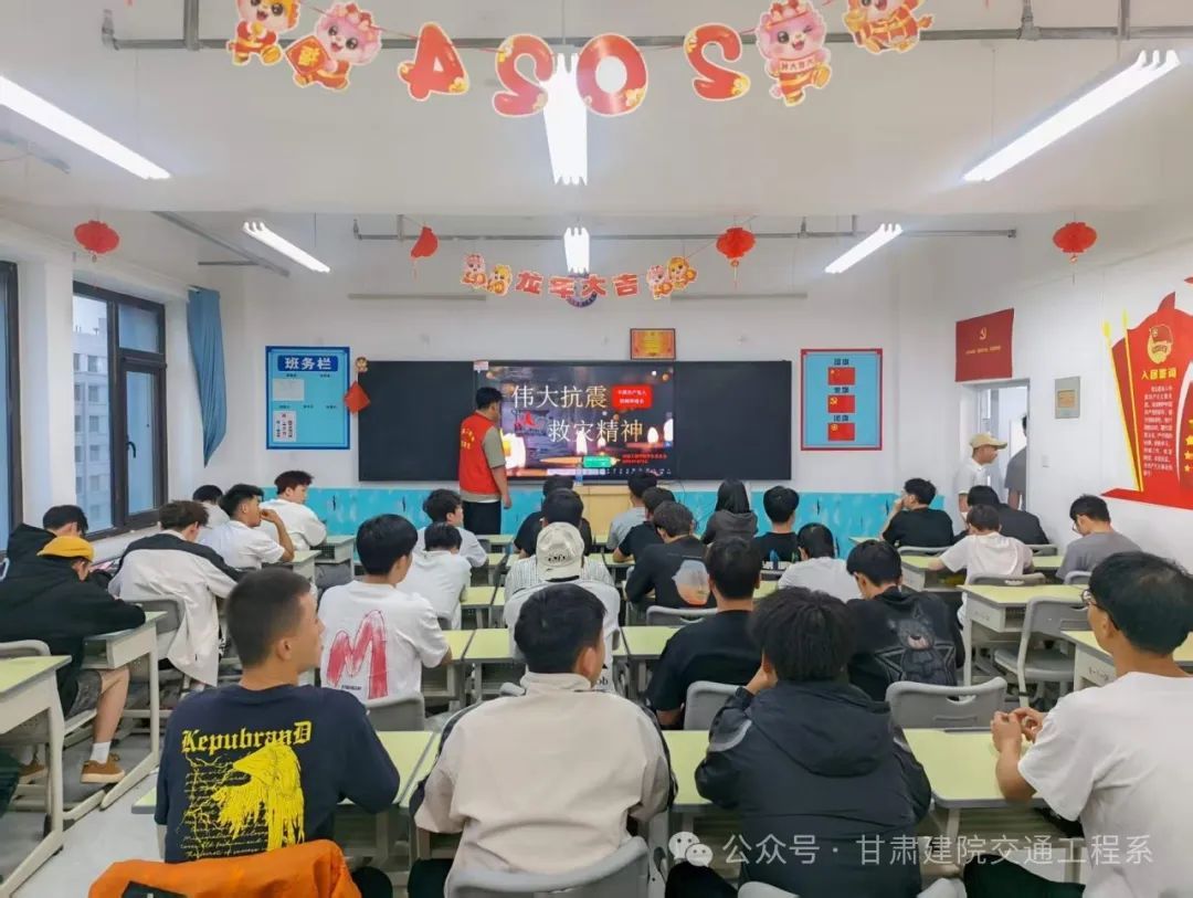 为传承和弘扬伟大抗震救灾精神,增强学生的社会责任感和使命感,2025年5月12日晚上7:30分,甘肃建筑职业技术学院交通工程学院学生委员会深入各班级开展“伟大抗震救灾精神”每月一学主题宣传活动。