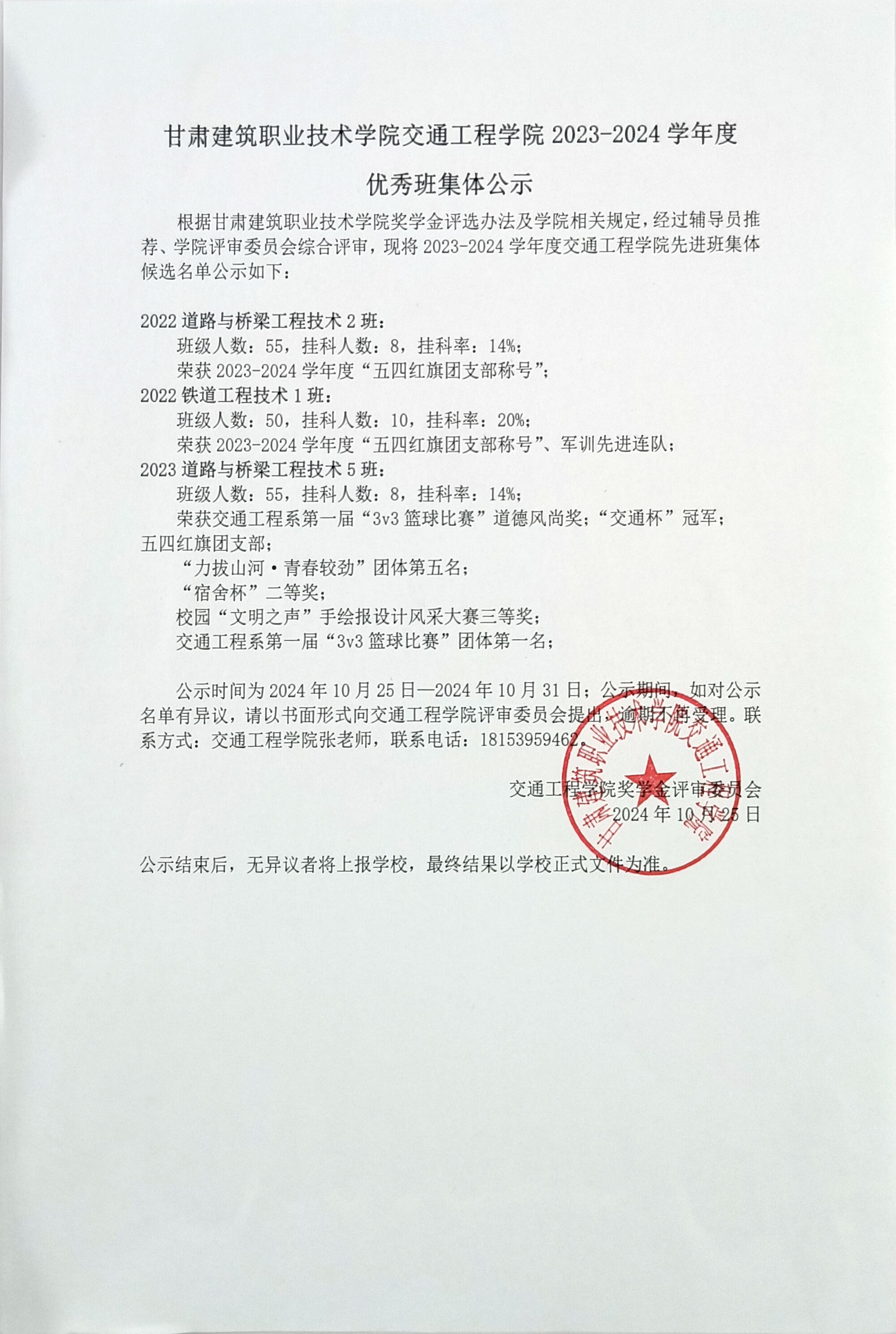 甘肃建筑职业技术学院交通工程学院2023-2024学年度优秀班集体公示