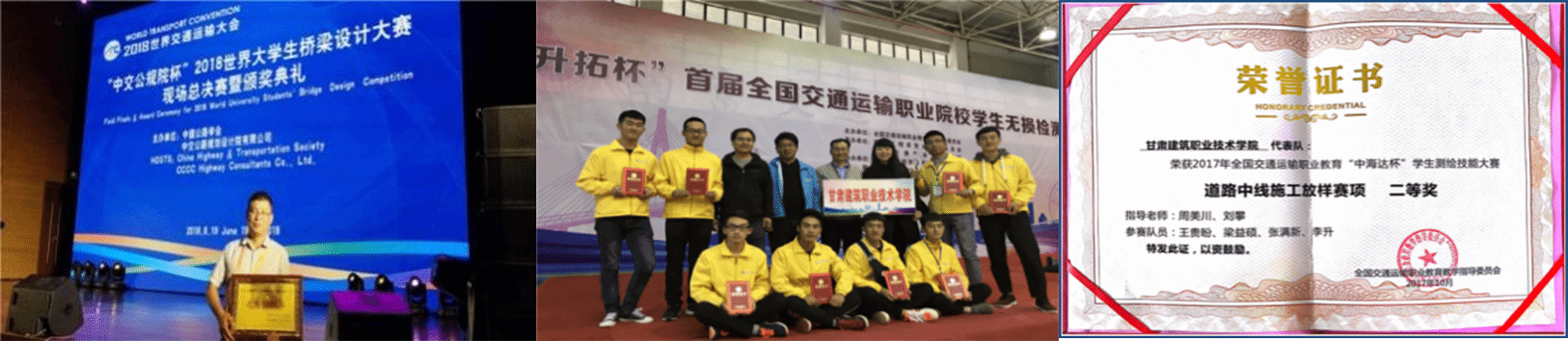 在道路桥梁工程技术实训基地(国家生产性实训基地)、校企共建交通土建类专业群生产性实训基地(甘肃省职业教育示范性实训基地)等平台之上,立足学生全面发展,实施“育训并举”策略,创建出高素质技术技能人才培养新模式。突出校企“二元”主体,强化认知能力、合作能力、创新能力和职业能力培养。本专业配备了一支结构合理、专业能力强、职业素质高、专兼结合的“双师”型教学团队,为学子成就学业梦想保驾护航。